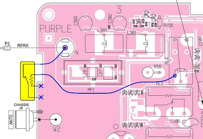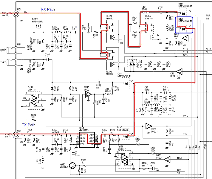 Some IC-756PRO (-2) tend to oscillate on 6m. This is caused by a loop-back from the antenna relais (TX/RX decoupling) via the RF board, passing the persistently switched input attenuator (2 relais) and the RX/TX isolator diode D131. Hereafter the RX path joins the TX small signal route via IC151 to the final amp.