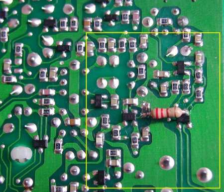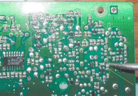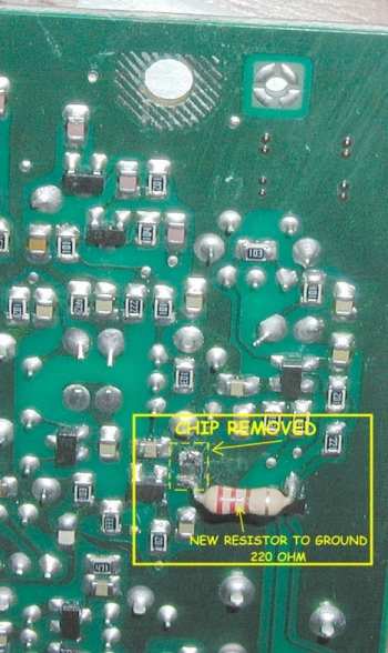 The NB correction removes the surface mounted 220-ohm resistor (R2046) from the source of Q2009, replacing it with a 220 ohm resistor connected between Q2009's source at C2027 and Q2016's (2SC4047) collector and the junction of R2049 (220-ohm also).