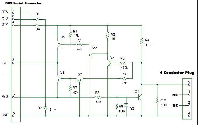 All resistors are 1/4 or 1/8watt - 5% tolerence resistors. This PC programming cable can also be built with